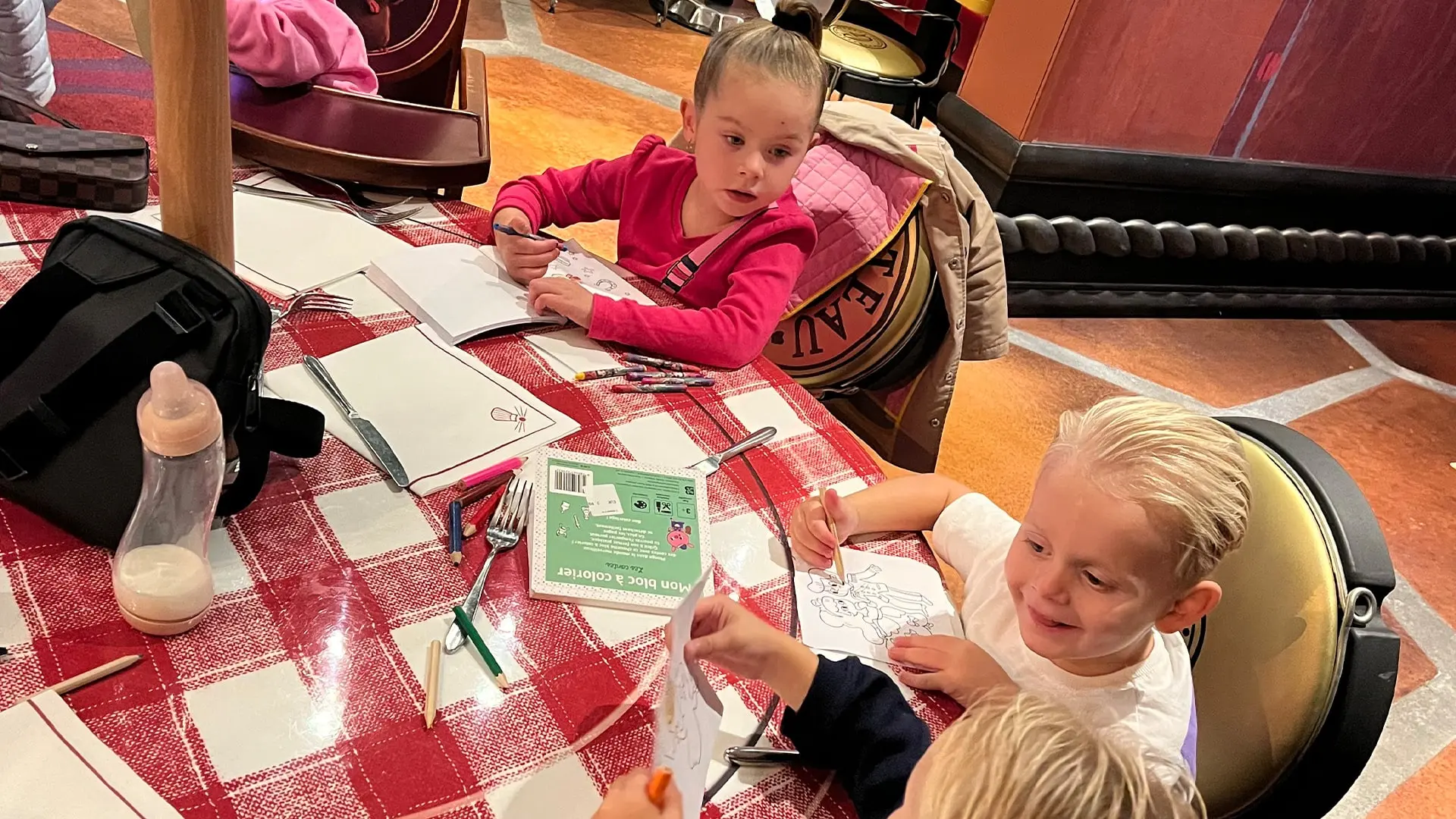 Lola en Jimmy zijn aan het kleuren aan de grote jampot tafel bij Bistrot Chez Rémy Hier waren we aan het lunchen bij Bistrot Chez Rémy