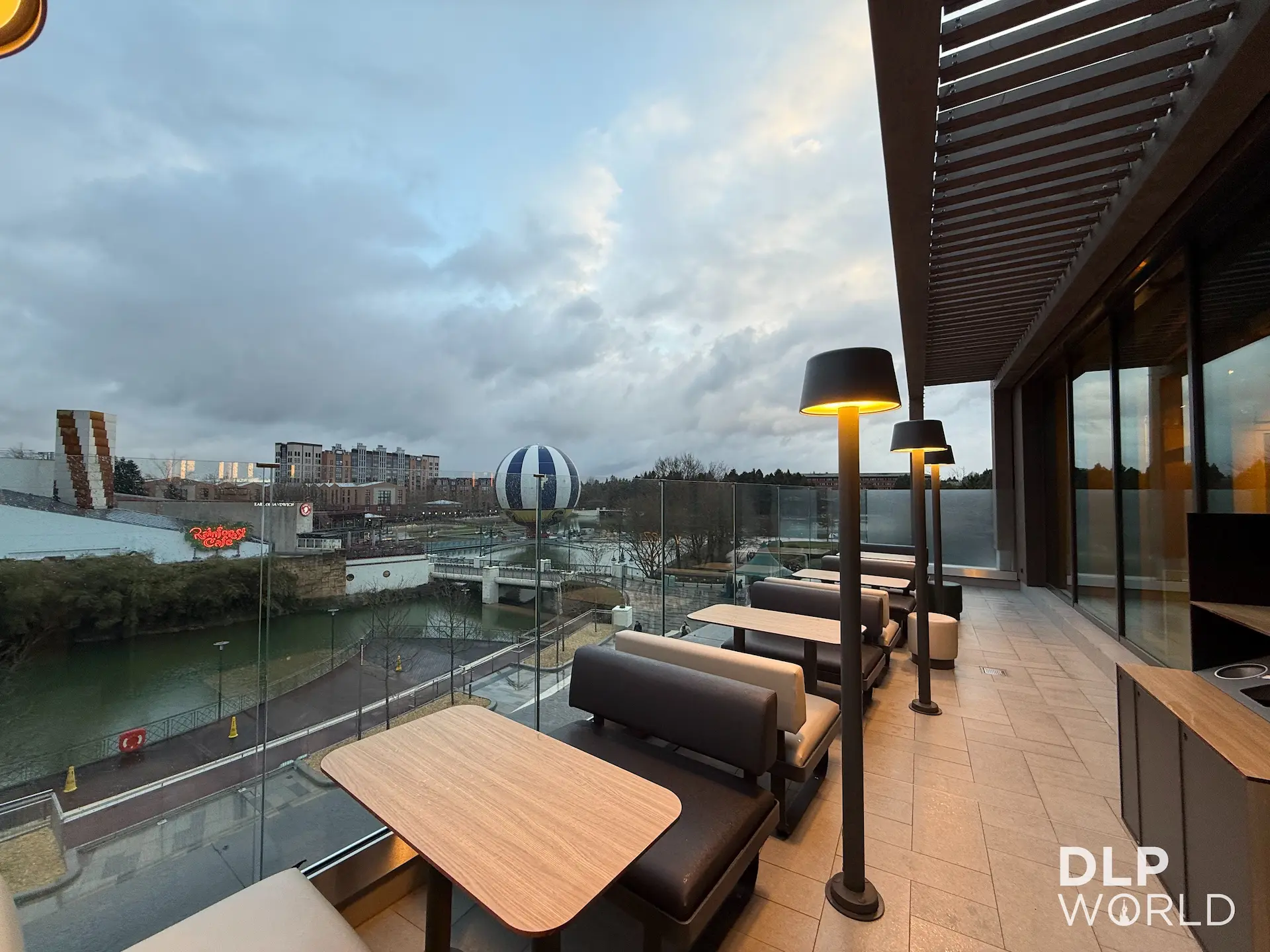 Op de bovenste terrassen heb je uitzicht over Disney Village. Op een zonnige dag zijn die plekken snel bezet — kom op tijd of wacht gericht op een tafel die vrijkomt.