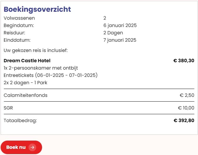 Voor een overnachting in het Dream Castle Hotel betaal je wat meer dan een overnachting in een eenvoudiger alternatief, zoals B&B Hotel en Campanile. Ook voor dit hotel geldt dat een verblijf boeken met gedateerde tickets voor één park per dag via C&O travel veruit het meest voordelig is! Bij aankomst op 6 januari 2025 boek je bijvoorbeeld al een verblijf voor twee dagen, twee volwassenen, inclusief ontbijt en twee dagen toegang tot de parken (één park per dag) voor €392,80. Meer informatie en boeken >>