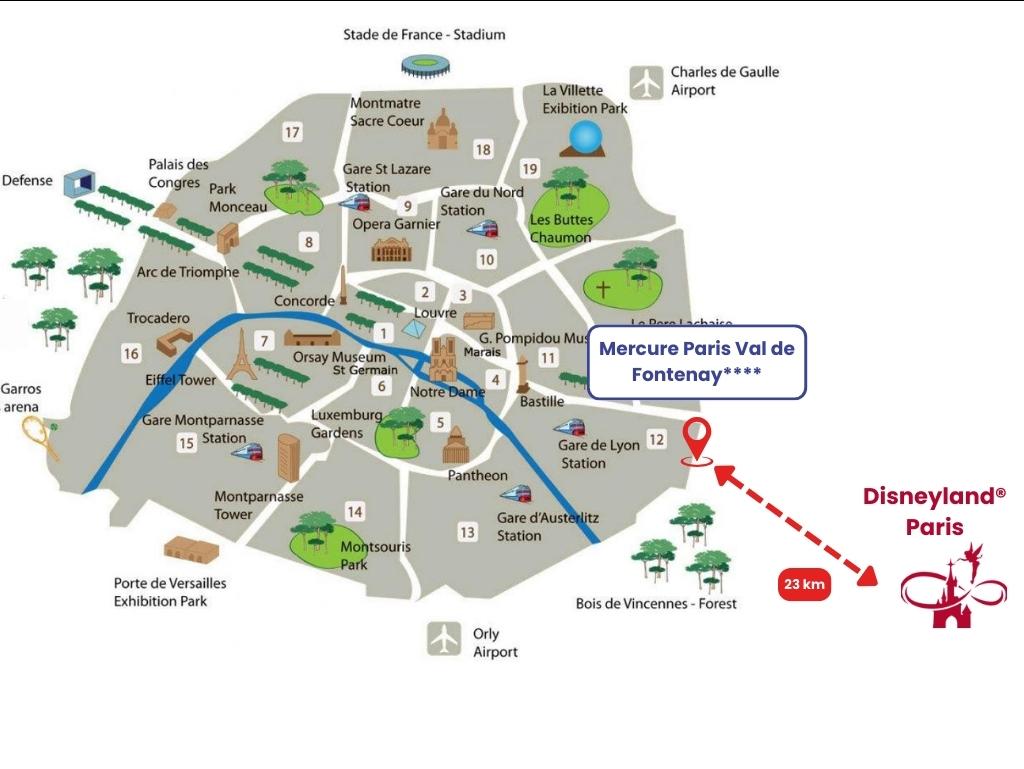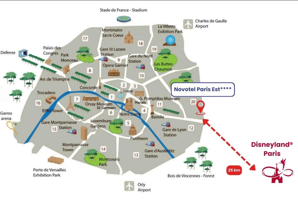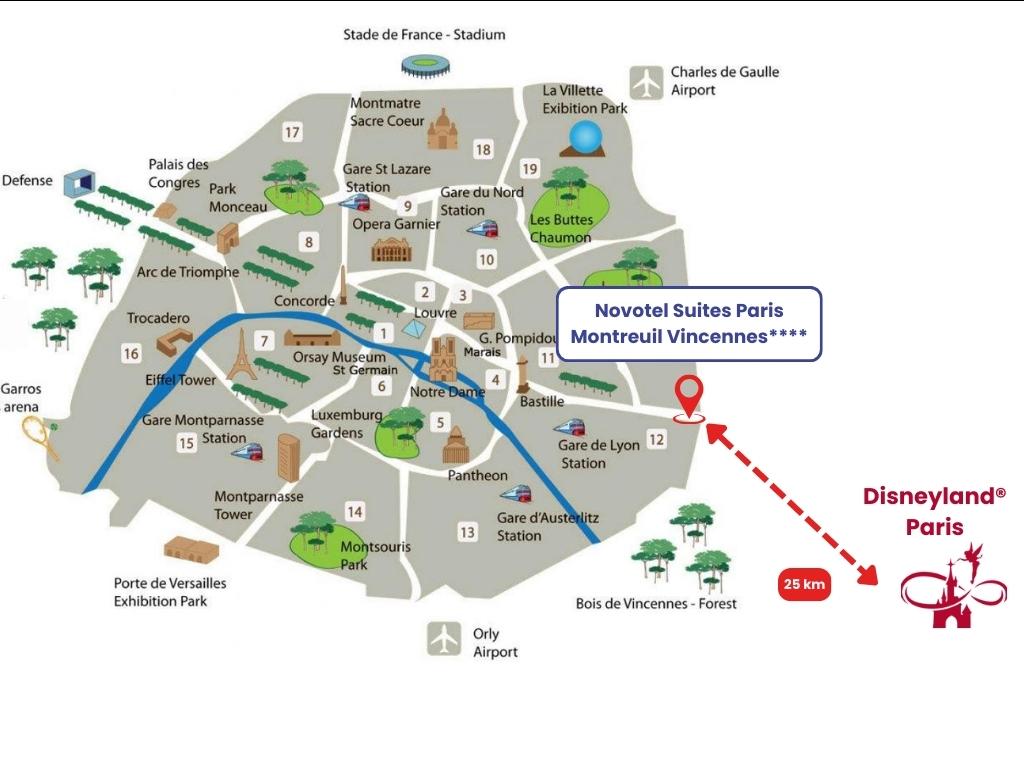 - Locatie en bereikbaarheid: Gelegen op slechts 23 km van Disneyland® Paris. Met de RER A-trein sta je in 25-29 minuten voor de poorten van de magie. De andere kant op reis je in minder dan 20 minuten naar het hart van Parijs.