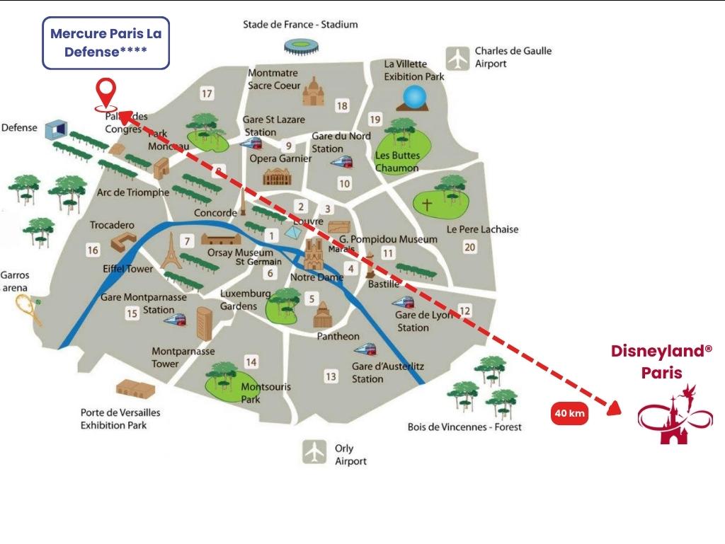 - Locatie en bereikbaarheid: Ligt op 40 km van Disneyland® Paris, maar nog steeds uitstekend verbonden via de RER A-lijn (reistijd ca. 52 minuten). Het grote voordeel is dat je in slechts 5 minuten met de metro op de Champs-Élysées staat.